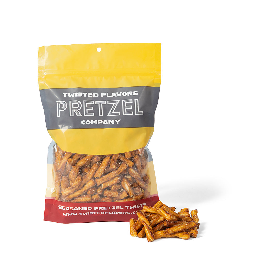 Savory, cheesy, and full of bold flavor—our Garlic Parmesan Seasoned Gourmet Pretzel Twists are a snack that delivers. Each 6 cup resealable bag is packed with over 1/2 pound of crunchy pretzels coated in roasted garlic and real parmesan cheese seasoning.