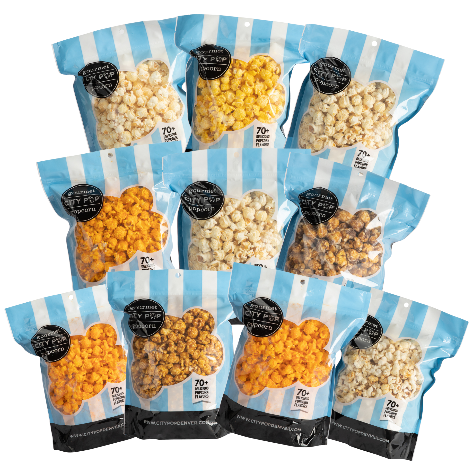 Experience the ultimate popcorn variety with City Pop’s Supreme Combo, featuring ten of our most-loved flavors in one spectacular pack. This premium collection includes White Cheddar, Kettle, Jalapeño Cheddar, Cheese, Caramel, Extra Butter, Sea Salt & Cracked Pepper, Cheese & Caramel Mix, Chocolate Drizzle, and Low Salt, offering something for every craving, from savory to sweet and everything in between.